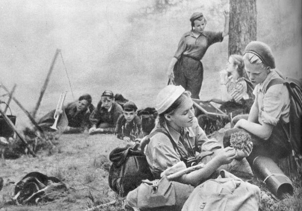 В СССР же, напротив, развитие туризма носило исключительнопролетарский характер и было направлено на изучение собственной страны. На открывшемся3 апреля 1932 года в Москве первомВсесоюзном съезде Общества пролетарского туризма и экскурсий (ОПТЭ), в котором участвовало почти 300 делегатов со всех уголков страны, была провозглашена теснаясвязь советского туризма с социалистическим строительством. Так,одной из главных задач наших туристов был поиск сырья для нужд пятилетки. Тысячи молодых энтузиастов с заплечными рюкзаками двинулись искать апатиты на ледяных просторах Севера, серу в пустыне Каракумы, медь в Казахстане, перламутр в Карелии, нефть на Сахалине. Иногда эти изыскания действительно давали плоды.