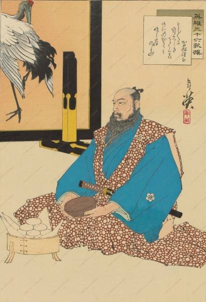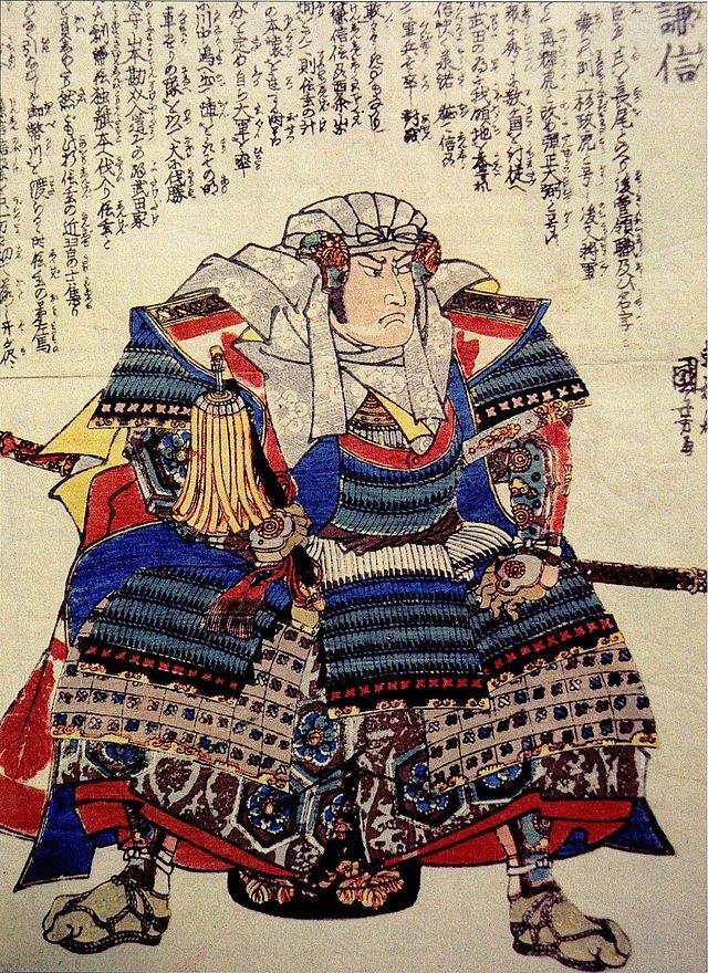 Как и многие другие самураи Уэсугэ Кэсин был не только прекрасным полководцем, но и ничуть не менее хорошим поэтом. Цветная ксилография Утагава Куниёси.
