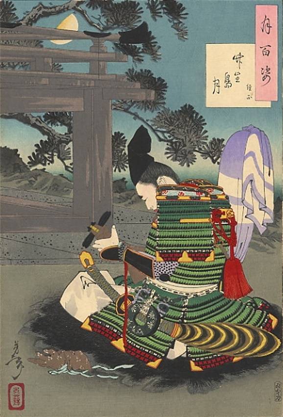 На этой гравюре (Цукиока Ёситоси, 1886 г.) самурай в полном вооружении играет на биве.