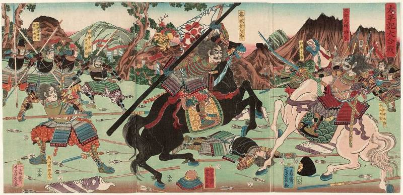 Великая битва. Утагава Ёсикадзу. Триптих 1855 г. Обратите внимание, какой поистине огромной палицей канабо сражается её центральный персонаж. Понятно, что таких воинов можно было прославлять и в живописи, и в стихах.