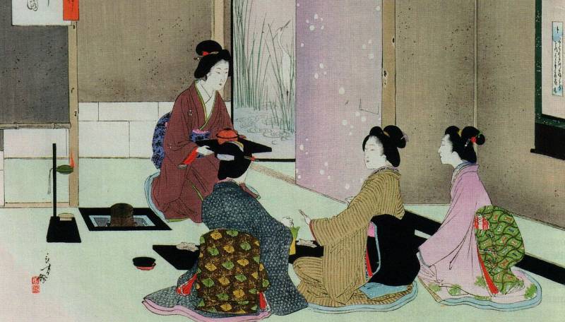 Женщины пьют чай и играют в стихи. Художник Мицуно Тосиката (1866 – 1908).