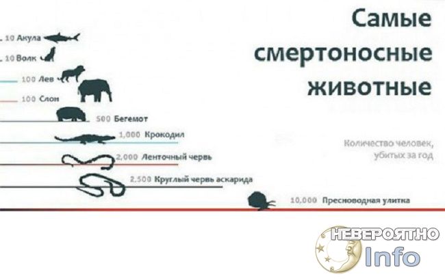 | Поразительные статистические данные, составленные компетентными биологами, опубликованные нынче сразу в нескольких СМИ самых различных направлений, поистине удивляют. Оказывается, все хищники, вместе взятые, уничтожают людей меньше, чем упомянутая улитка. Прилагаемый график наглядно демонстрирует, что и в самом деле страшней улитки зверя нет. Они убивают, как минимум, десять тысяч (!) человек ежегодно. Беда в том, что сравнительно крошечные и очень медленные создания почти поголовно являются переносчиками шистосомоза. Это чрезвычайно неприятное заболевание, провоцируемое паразитическими червями, которые в природе и живут на этих самых улитках. Соответственно, микроскопическими паразитами оказывается заражена и вся вода, в которой обитают симпатичные и кажущиеся совершенно безвредными «ползучие игрушки». При контакте с такой водой черви с улиток перебираются под кожу человека (обычно — в районе живота), откладывая там яйца. К сожалению, крайне часто это приводит и к летальному исходу. Констатируя это, учёные предостерегают: опасайтесь не только и не столько «больших, зубастых и кровожадных»! Смерть – она подстерегает повсюду, так что берегите себя!