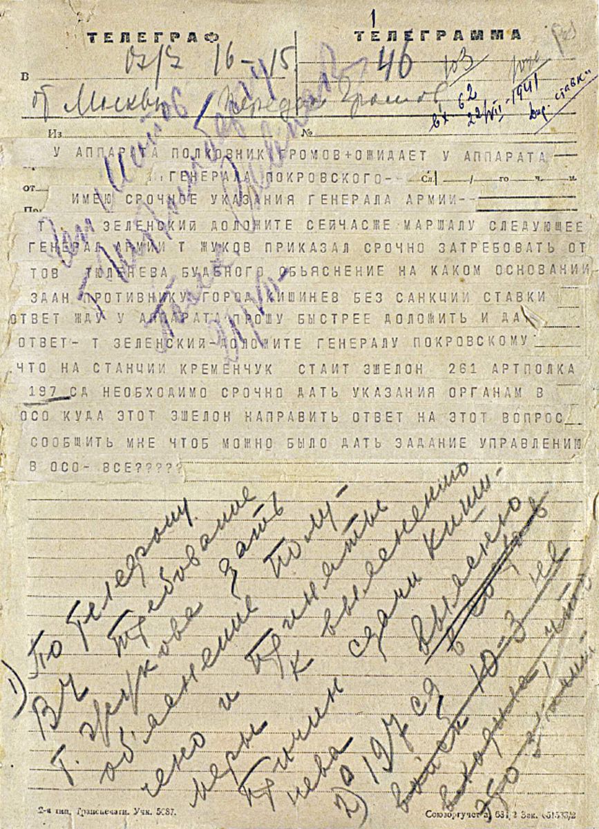 Т. Зеленский (офицер штаба Будённого. – Авт.), доложите сейчас же маршалу следующее: генерал армии т. Жуков приказал срочно затребовать от тов. Тюленева (командующий войсками Южного фронта. – Авт.), Будённого объяснение, на каком основании сдан противнику город Кишинёв без санкции Ставки. Ответ жду у аппарата. Прошу быстрее доложить и дать ответ […]»