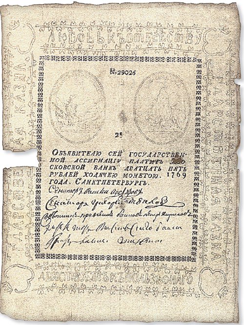 Любовь русских правителей к необеспеченной эмиссии длится столько же, сколько в России существуют бумажные деньги, то есть с 29 декабря 1768 года, когда Екатерина II ввела во внутреннее обращение ассигнации. Ассигнации первого выпуска номиналами в 100, 75, 50 и 25 рублей печатались вплоть до 1786 года. Потом, в 1786–1787 годах, старые выпуски обменивались на новые нарицательной стоимостью в 100, 50, 25, 10 и 5 рублей. На самой большой, 100-рублёвой купюре позже появилось изображение императрицы Екатерины II, вот почему в народе эту купюру прозвали «катя» или «катенька».
