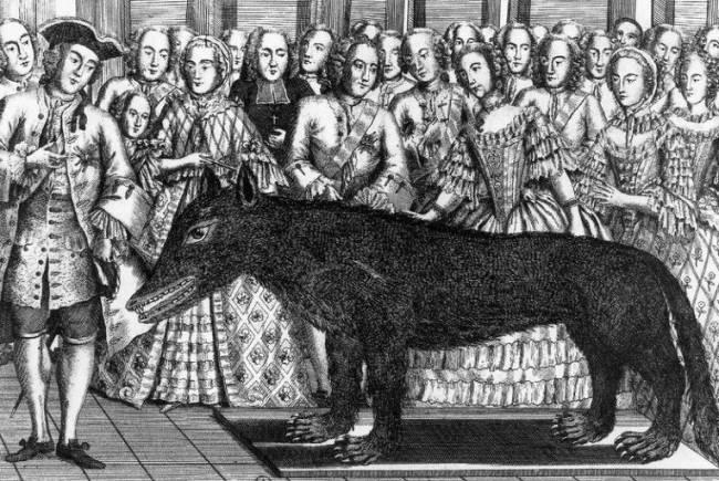 На фото: гравюра, изображающая чучело убитого жеводанского зверя при дворе короля Людовика XV.