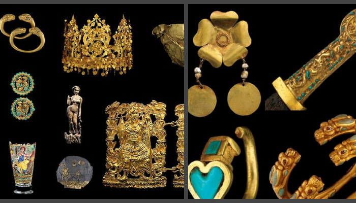 Археологи смогли исследовать еще пять захоронений, и все они также были доверху засыпаны драгоценностями, общее количество которых достигло 20000, а вес – более шести тонн. Сенсационная находка получила название “Золото Бактрии”. И хотя сами конструкции могил были довольно примитивны, их содержимое, а также короны на головах погребенных, явно указывало на то, что они представляют собой царские захоронения, и, скорее всего, тайные.