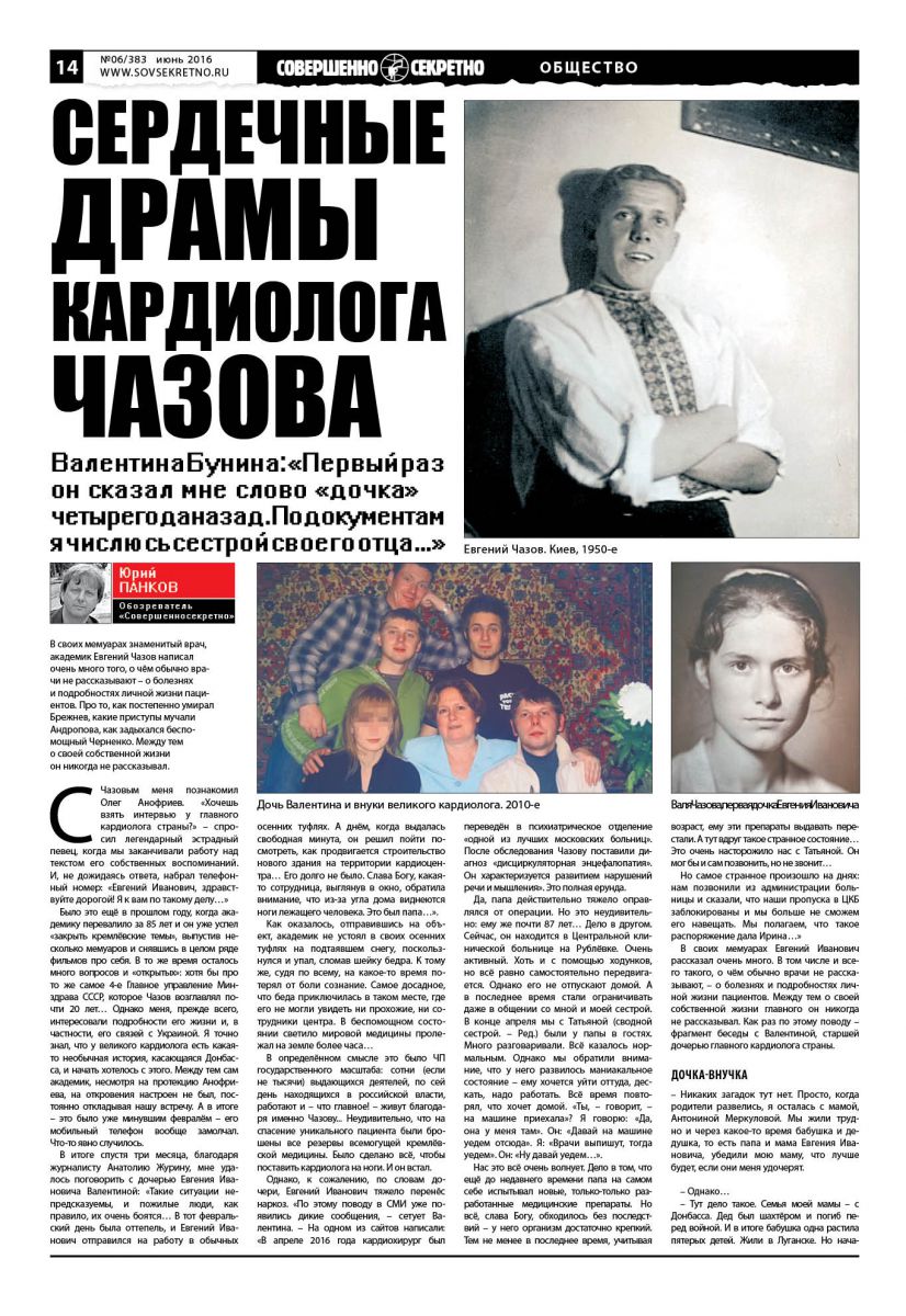 Было это ещё в прошлом году, когда академику перевалило за 85 лет и он уже успел «закрыть кремлёвские темы», выпустив несколько мемуаров и снявшись в целом ряде фильмов про себя. В то же время осталось много вопросов и «открытых»: хотя бы про то же самое 4-е Главное управление Минздрава СССР, которое Чазов возглавлял почти 20 лет… Однако меня, прежде всего, интересовали подробности его жизни и, в частности, его связей с Украиной. Я точно знал, что у великого кардиолога есть какая-то необычная история, касающаяся Донбасса, и начать хотелось с этого. Между тем сам академик, несмотря на протекцию Анофриева, на откровения настроен не был, постоянно откладывая нашу встречу. А в итоге – это было уже минувшим февралём – его мобильный телефон вообще замолчал. Что-то явно случилось.