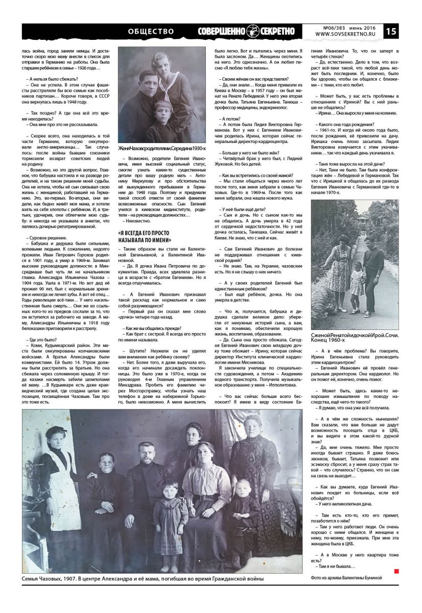 – Бабушка и дедушка были сильными, волевыми людьми. К сожалению, недолго прожили. Иван Петрович Горохов родился в 1901 году, а умер в 1969-м. Занимал высокие руководящие должности: в Минсредмаше был чуть ли не начальником главка. Александра Ильинична Чазова – 1904 года. Ушла в 1971-м. Но вот дед её прожил 90 лет, был с нормальным зрением и никогда не лечил зубы. А вот её отец… Годы революции всё-таки… У него насильственная была смерть… Они же из ссыльных: кого-то из предков сослали за то, что он вступился за рабочего на заводе. А ма-