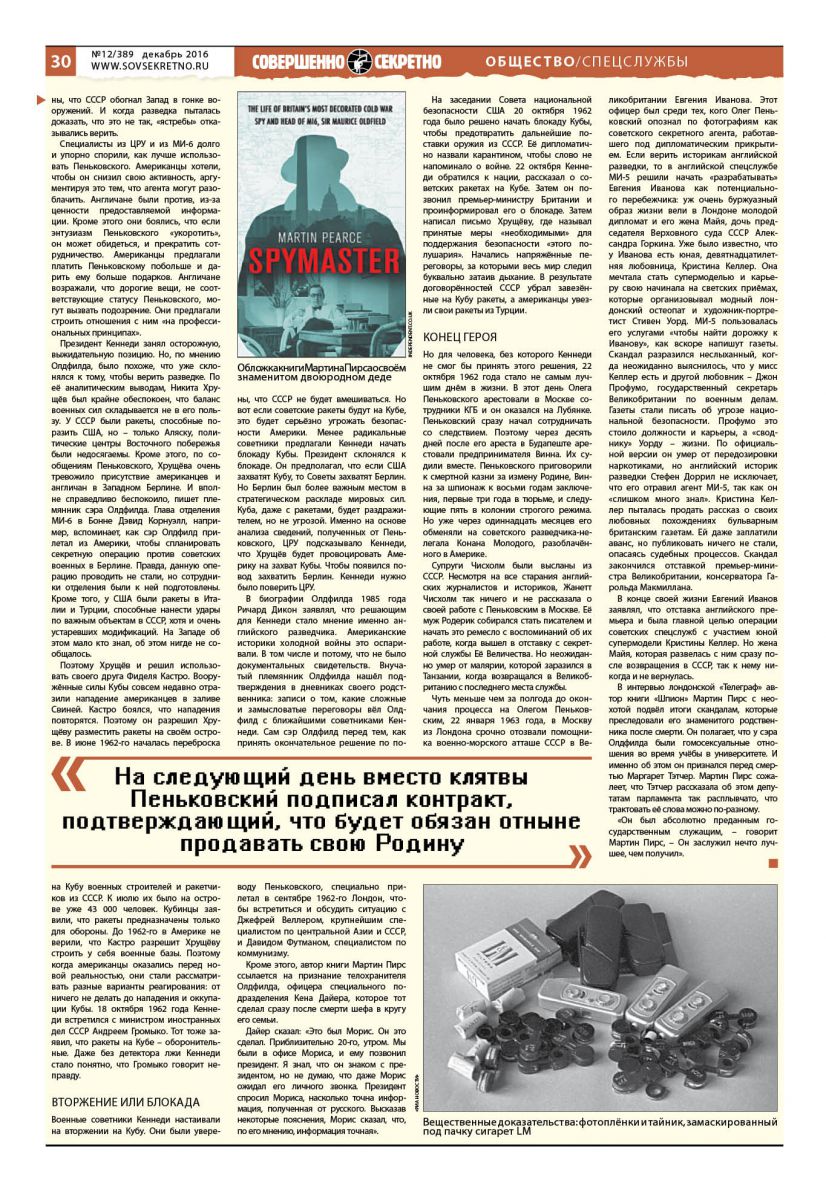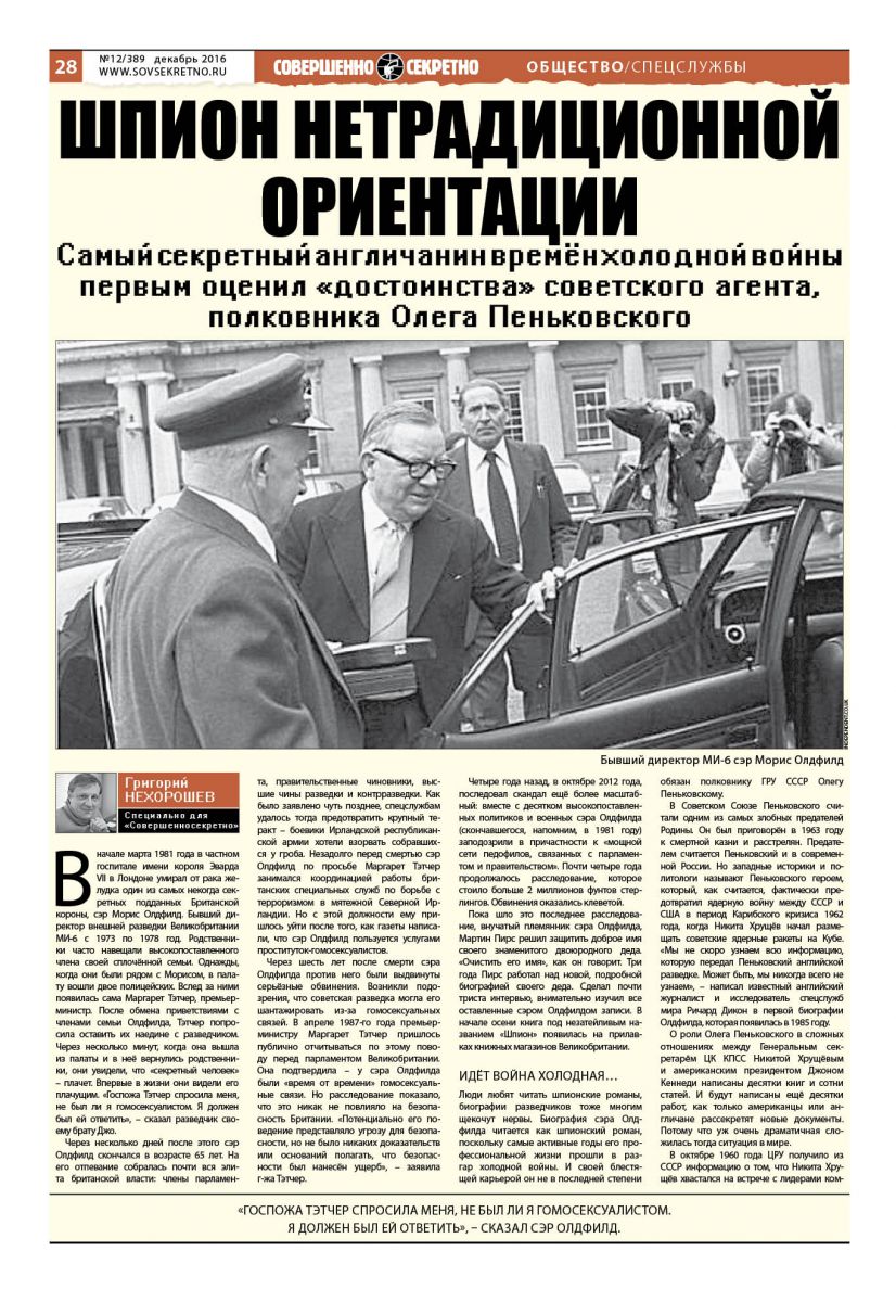 Люди любят читать шпионские романы, биографии разведчиков тоже многим щекочут нервы. Биография сэра Олдфилда читается как шпионский роман, поскольку самые активные годы его профессиональной жизни прошли в разгар холодной войны. И своей блестящей карьерой он не в последней степени обязан полковнику ГРУ СССР Олегу Пеньковскому.