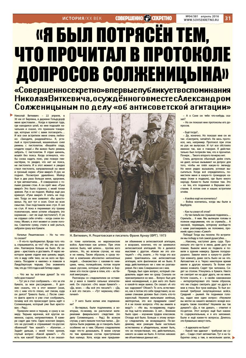 В нашей газетной публикации мы приводим основные эпизоды, касающиеся ареста Виткевича, а также его работы на кирпичном «гулаговском» заводе и в «шарашке» Марфино. Другие главы этого масштабного интервью, записанного Решетовской, содержат воспоминания Николая Виткевича о том, как этапировали заключённых из послевоенной Европы к местам лишения свободы, о том, как тяжело он выживал в лагерях Республики Коми. Этот богатый подробностями документальный материал будет полностью опубликован на сайте нашей газеты.