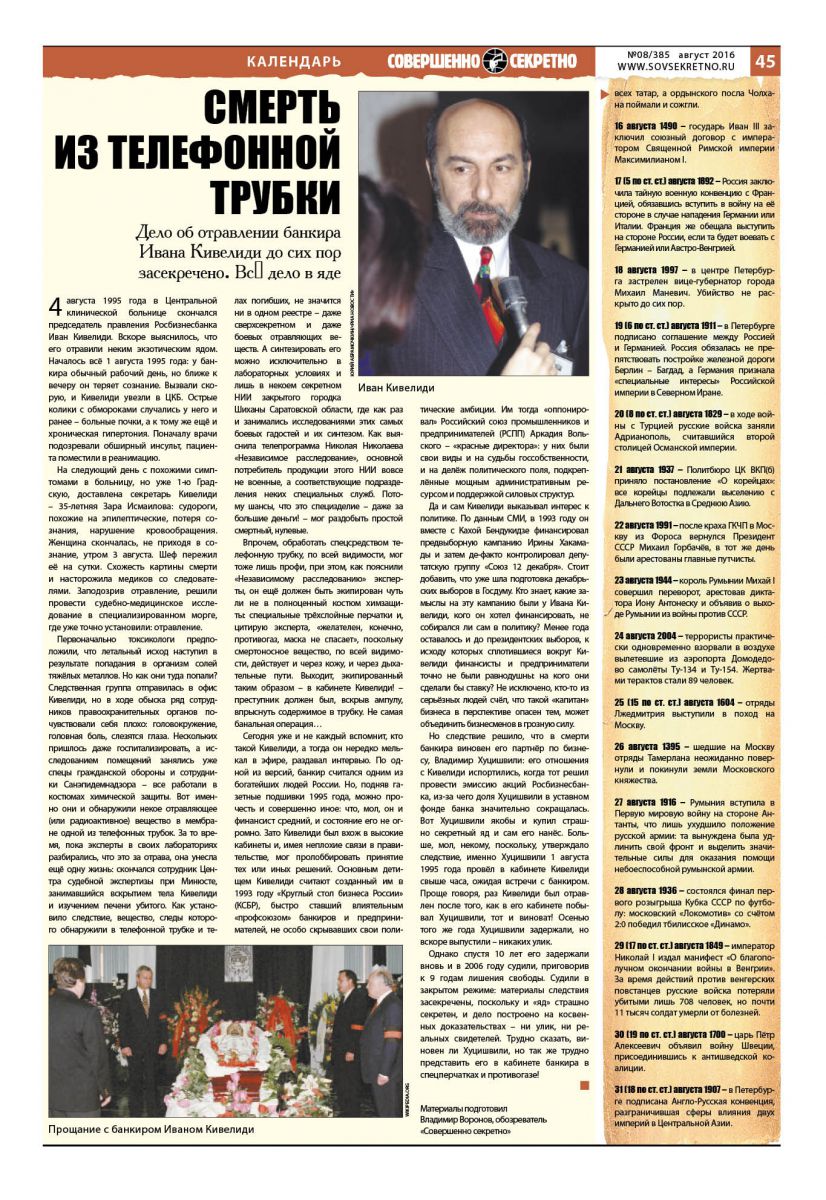 4 августа 1995 года в Центральной клинической больнице скончался председатель правления Росбизнесбанка Иван Кивелиди. Вскоре выяснилось, что его отравили неким экзотическим ядом. Началось всё 1 августа 1995 года: у банкира обычный рабочий день, но ближе к вечеру он теряет сознание. Вызвали скорую, и Кивелиди увезли в ЦКБ. Острые колики с обмороками случались у него и ранее – больные почки, а к тому же ещё и хроническая гипертония. Поначалу врачи подозревали обширный инсульт, пациента поместили в реанимацию.