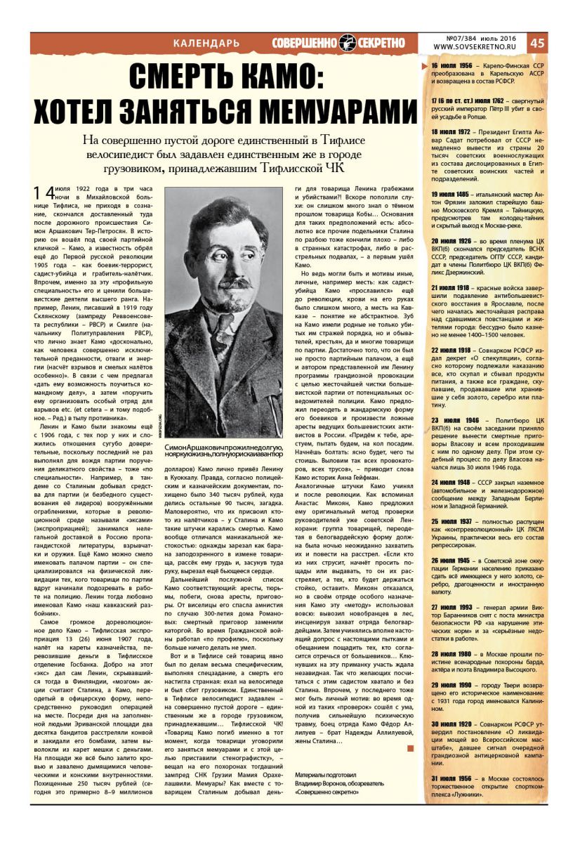 14 июля 1922 года в три часа ночи в Михайловской больнице Тифлиса, не приходя в сознание, скончался доставленный туда после дорожного происшествия Симон Аршакович Тер-Петросян. В историю он вошёл под своей партийной кличкой – Камо, а известность обрёл ещё до Первой русской революции 1905 года – как боевик-террорист, садист-убийца и грабитель-налётчик. Впрочем, именно за эту «профильную специальность» его и ценили большевистские деятели высшего ранга. Например, Ленин, писавший в 1919 году Склянскому (зампреду Реввоенсовета республики – РВСР) и Смилге (начальнику Политуправления РВСР), что лично знает Камо «досконально, как человека совершенно исключительной преданности, отваги и энергии (насчёт взрывов и смелых налётов особенно)». В связи с чем предлагал «дать ему возможность поучиться командному делу», а затем «поручить ему организовать особый отряд для взрывов etc. (et cetera – и тому подобное. – Ред.) в тылу противника».