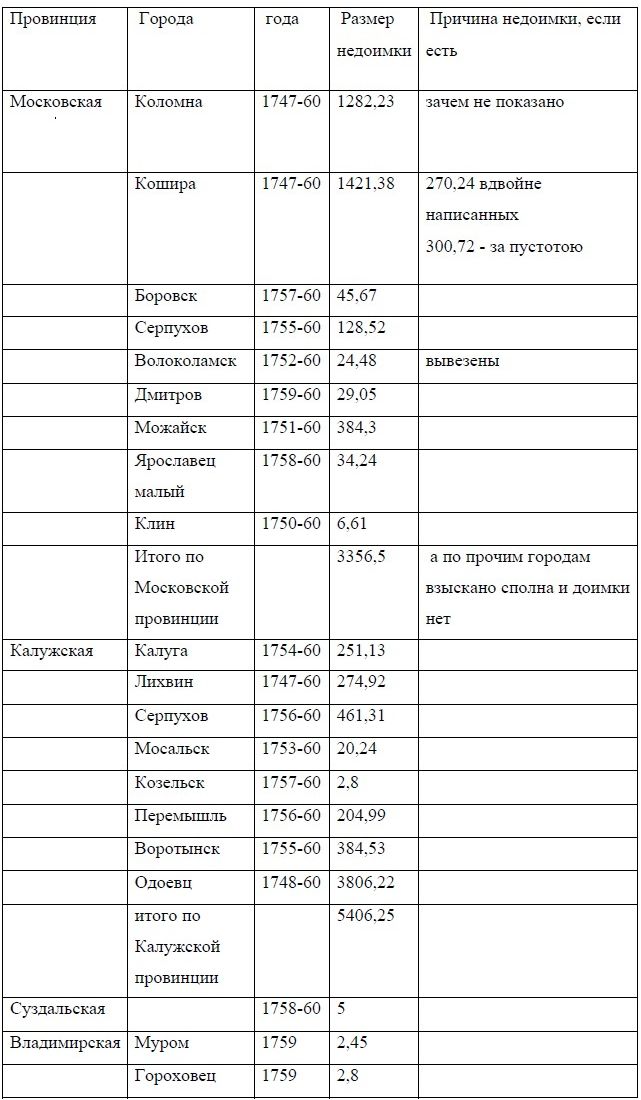 Насколько данные этой ведомости отражают реальное положение вещей? В ней содержатся данные о 30 провинциях, в которых проживало около 60% податного населения (3 704 390 из 6 336 360 душ мужского пола)50. Пустующие клетки в табл. 8 (по Тульской, Суздальской, Юрьевской, Пошехонской провинциям) следует интерпретировать не как нулевую, а как неизвестную недоимку, поскольку не из всех провинций регулярно и своевременно поступали отчеты, или не все поступившие отчеты были ревизованы. Это значит, что приводимая в таблице итоговая цифра отражает минимально возможный размер совокупной недоимки, а в действительности совокупная недоимка была выше.