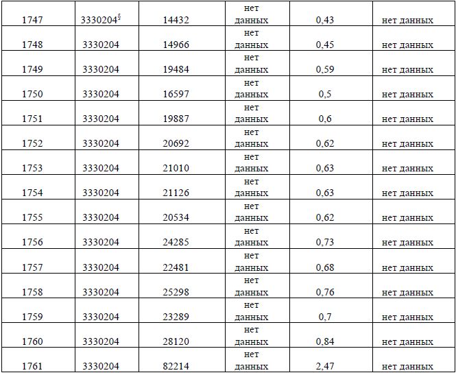 § С 1747 по 1761 г. процент недоимок указан для всех провинций, которые перечислены в таблице 8. Расчетная величина оклада – 3 330 204 рубля в год, расчет сделан на основании Переписи населения… вып. 3.