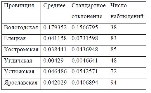 Таблица 4. Связь уровня недоимок по уездам и провинциям по семигривенному платежу на обрезанной выборке, без Вологодской провинции.