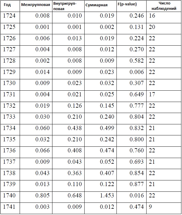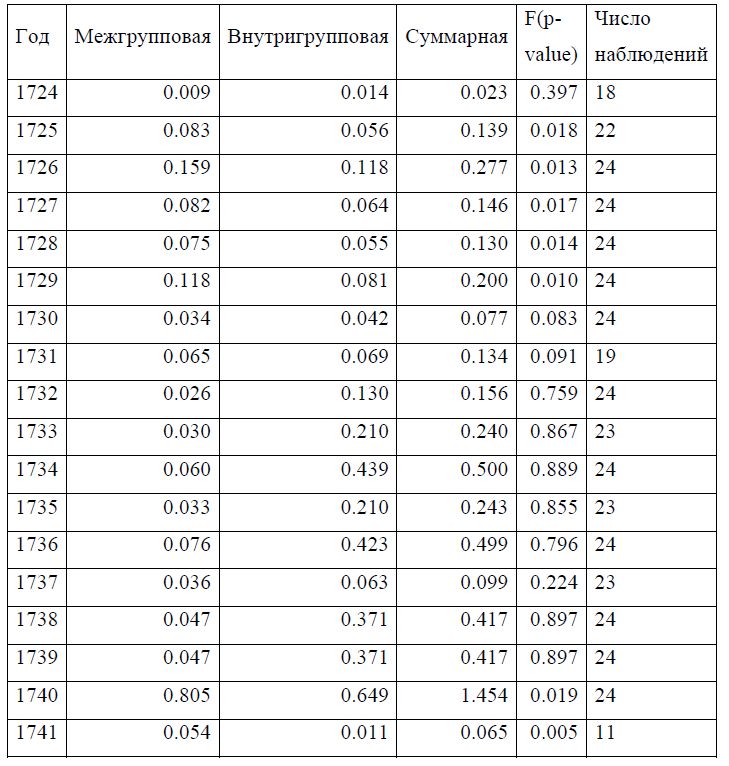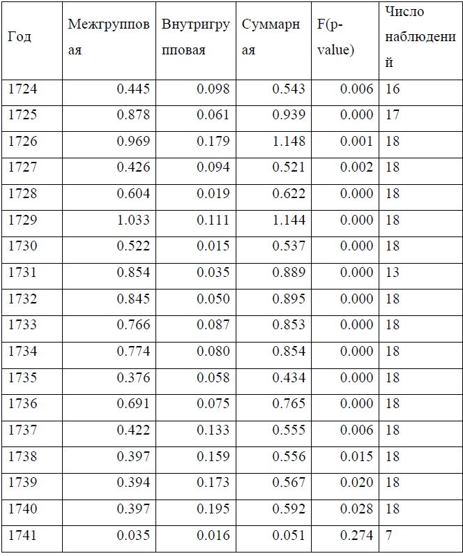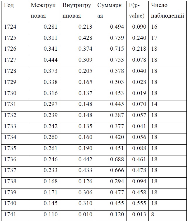 Вологодской провинции. Он был вызван очень большой недоимкой в Тотемском уезде, которая после 1731 г. уменьшилась. Если исключить этот регион, получается, что во за все рассматриваемые годы различия уровней межгрупповой и внутригрупповой дисперсии незначительны (приложение, табл. 4). В итоге по семигривенному платежу показатели уровня недоимочности внутри уездов одной провинции ближе друг другу, чем показатели уровня недоимочности между уездами разных провинций (это закономерность выполняется для всех лет).