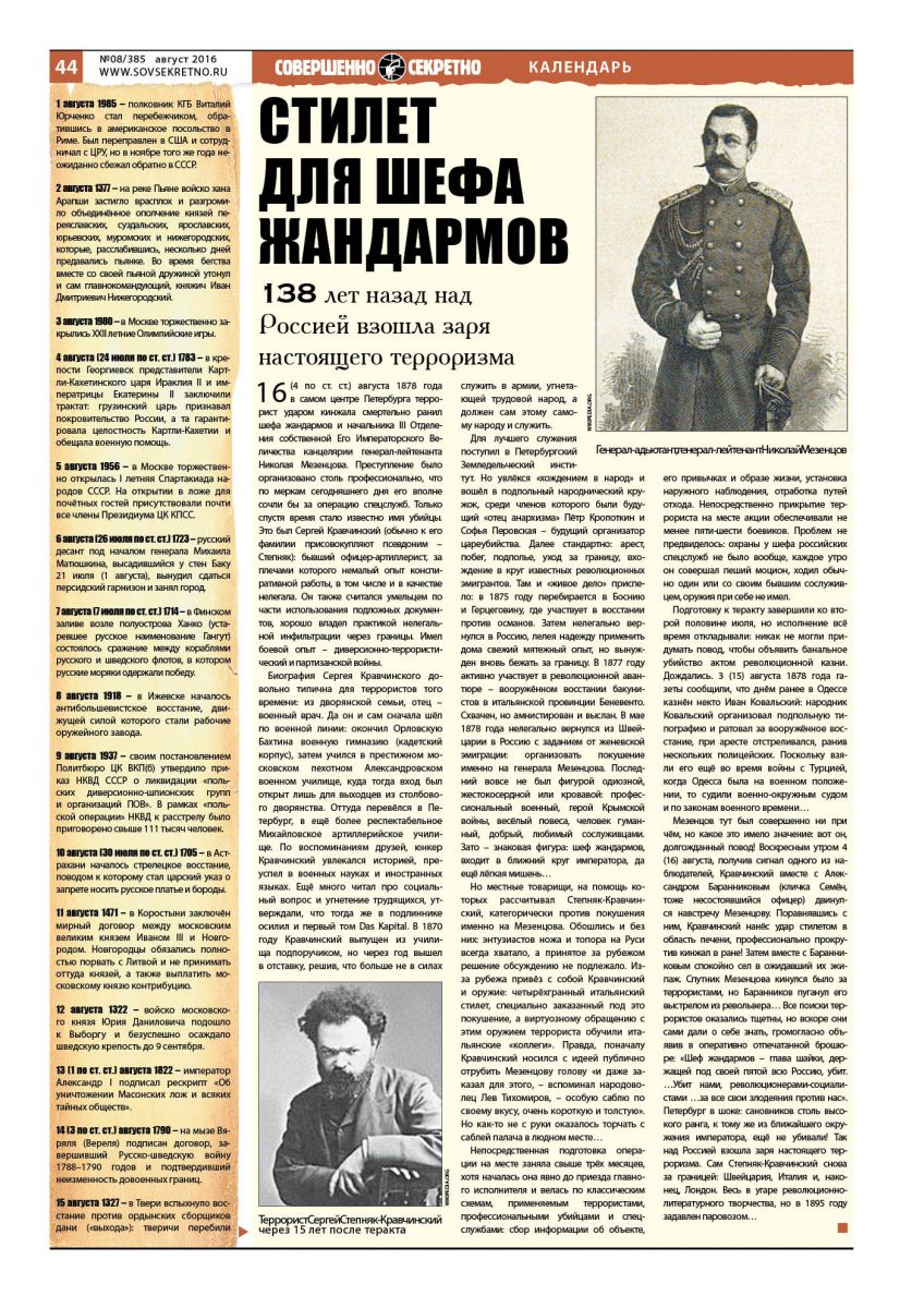 6 (4 по ст. ст.) августа 1878 года в самом центре Петербурга террорист ударом кинжала смертельно ранил шефа жандармов и начальника III Отделения собственной Его Императорского Величества канцелярии генерал-лейтенанта Николая Мезенцова. Преступление было организовано столь профессионально, что по меркам сегодняшнего дня его вполне сочли бы за операцию спецслужб. Только спустя время стало известно имя убийцы. Это был Сергей Кравчинский (обычно к его фамилии присовокупляют псевдоним – Степняк): бывший офицер-артиллерист, за плечами которого немалый опыт конспиративной работы, в том числе и в качестве нелегала. Он также считался умельцем по части использования подложных документов, хорошо владел практикой нелегальной инфильтрации через границы. Имел боевой опыт – диверсионно-террористический и партизанской войны.