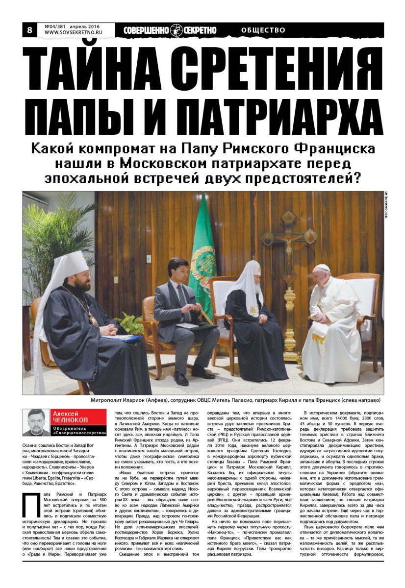 Возможно, патриарх Кирилл вскоре почувствовал, что текст декларации невызвал того интереса, который соответствовалбы эпохальной встрече Запада иВостока. Аиначе зачем он вдруг заявил вовсеуслышание, что есть мощные силы, которые препятствовали этой встрече? Тем более это сенсационное заявление было сделано уже вбразильском городе Сан-Паулу, после другого беспрецедентного решения патриарха поездки вАнтарктиду, которая должна была возгнать донебес интерес клатиноамериканскому турне предстоятеля. Ноожидания этого, видимо, неоправдались, итогда-то Патриарх Московский Кирилл стал рассказывать осекретности, сопровождавшей подготовку его встречи сПапой Римским.