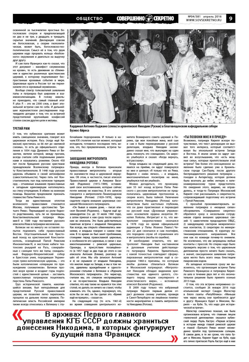 Можно догадаться, что происшедшая 55 лет назад встреча Папы Римского срусским митрополитом непредполагалась церковным протоколом и, скорее всего, была тайной. Увлечение митрополита Никодима (Ротова) католичеством было настолько глубоким, что он даже практиковал ипереводил нарусский язык Духовные упражнения основателя ордена иезуитов Игнатия Лойолы. Интригует ито, что митрополит скоропостижно скончался в1978году вовремя официальной аудиенции уПапы Иоанна Павла I. Через 22 дня скончался исам понтифик, что породило слухи оботравлении его имитрополита (якобы поошибке).