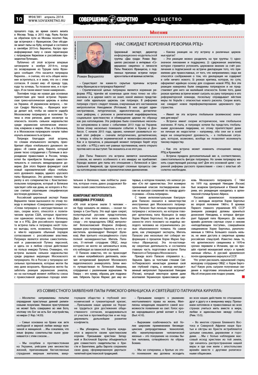 Российский церковный эксперт Роман Вершилло также высказался поэтому поводу винтервью Совершенно секретно: Слова патриарха омогущественных силах, скорее всего, относятся кполитическим кругам США, которые практически одинаково холодны как кВатикану, так икРПЦ. Для российского президента встреча папы ипатриарха несёт только выгоды, хотя, возможно, Патриархия вчём-то нарушила обычный порядок согласования сроссийскими властями. Патриарх является вполне самостоятельной иравновесной Путину персоной, издесь он влюбом случае действовал напользу имиджу Путина. Очевидно, что встреча вызвала сильное недовольство среди рядовых верующих Московского патриархата. НовРоссии упатриарха нет сильных противников, которые моглибы ему даже возразить. Франциска моглабы заботить реакция украинских униатов, нона настоящий момент лоббисты союза справославной церковью гораздо влиятельнее вВатикане, чем лоббисты униатов, которые очень давно раздражают Ватикан своей самостоятельностью.