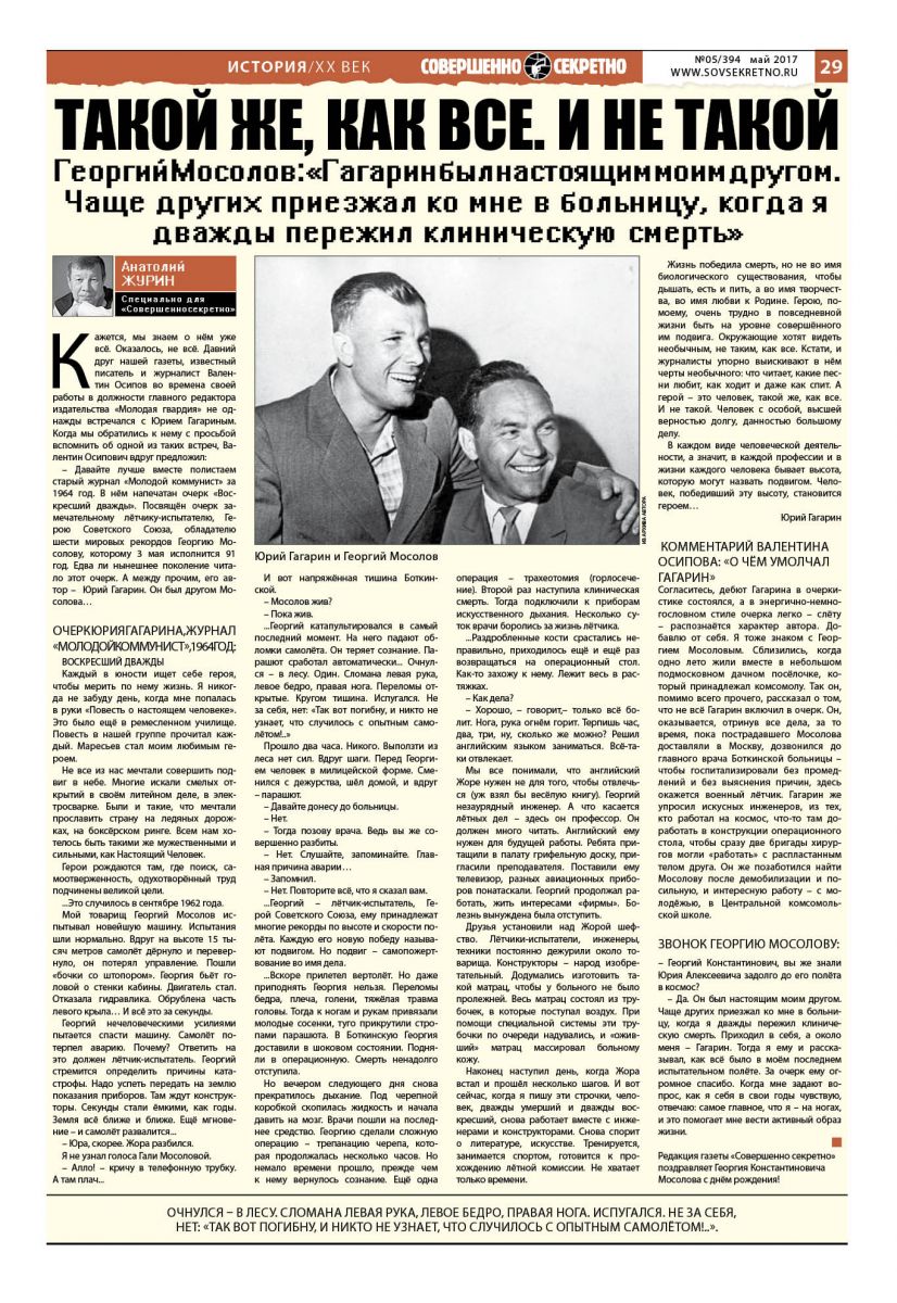 – Давайте лучше вместе полистаем старый журнал «Молодой коммунист» за 1964 год. В нём напечатан очерк «Воскресший дважды». Посвящён очерк замечательному лётчику-испытателю, Герою Советского Союза, обладателю шести мировых рекордов Георгию Мосолову, которому 3 мая исполнится 91 год. Едва ли нынешнее поколение читало этот очерк. А между прочим, его автор – Юрий Гагарин. Он был другом Мосолова…