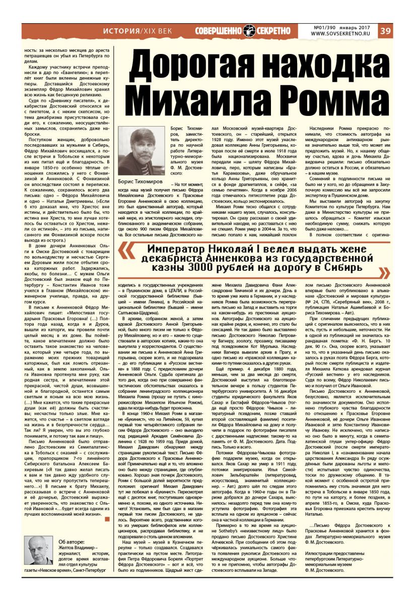 Михаил Ромм тесно общался с сотрудниками нашего музея, случалось, консультировал. Он сразу рассказал о своей удивительной находке, но расставаться с нею не спешил. Ромм умер в 2004-м. За то, что письмо попало к нам, нижайший поклон жене Михаила Давидовича Фани Александровне Темчиной и их дочери. Дочь в то время уже жила в Германии, и у наследников Ромма была возможность переправить письмо на Запад и выставить на торги на каком-нибудь из престижных аукционов. Автографы Достоевского на аукционах крайне редки, и, конечно, это стало бы сенсацией. Не так давно было выставлено письмо Достоевского Николаю Петровичу Вагнеру, зоологу, прозаику, писавшему под псевдонимом Кот Мурлыка. Наследники Вагнера вывезли архив в Прагу, и одно письмо из «пражской коллекции» какими-то путями оказалось в других руках.