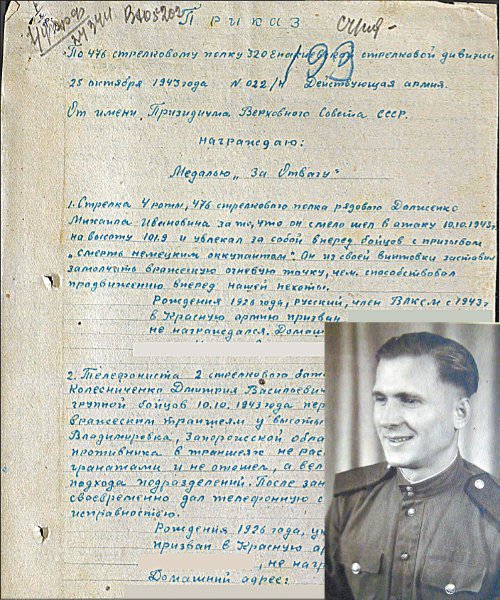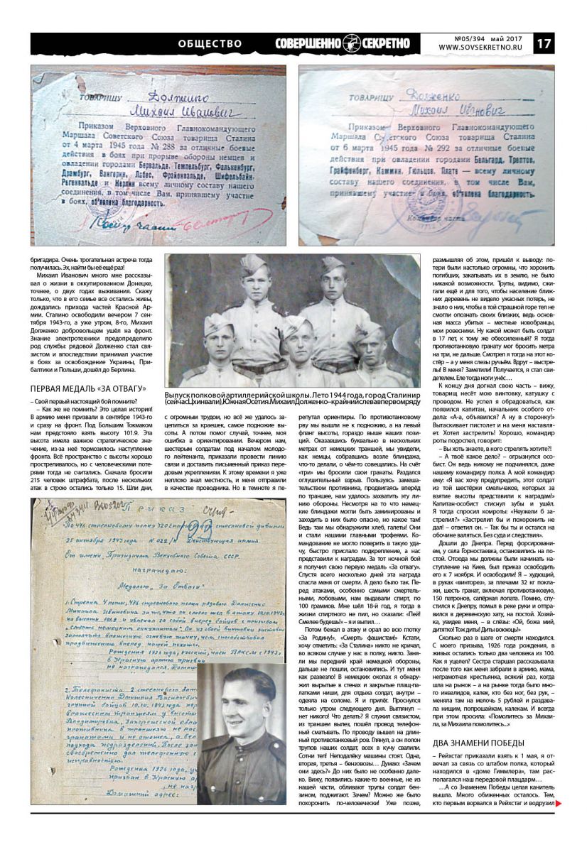 74 года прошло с того времени, как 17-летний Миша Долженко ушёл добровольцем на фронт в составе 4-й роты 476-го стрелкового полка 320-й Енакиевской стрелковой дивизии. А затем через два года уже сержантом-связистом 674-го полка 150-й стрелковой Идрицкой дивизии дошёл до стен Рейхстага. Но помните, как сказал Михаил Иванович про ужас, который довелось пережить: «Горьки мои воспоминания».