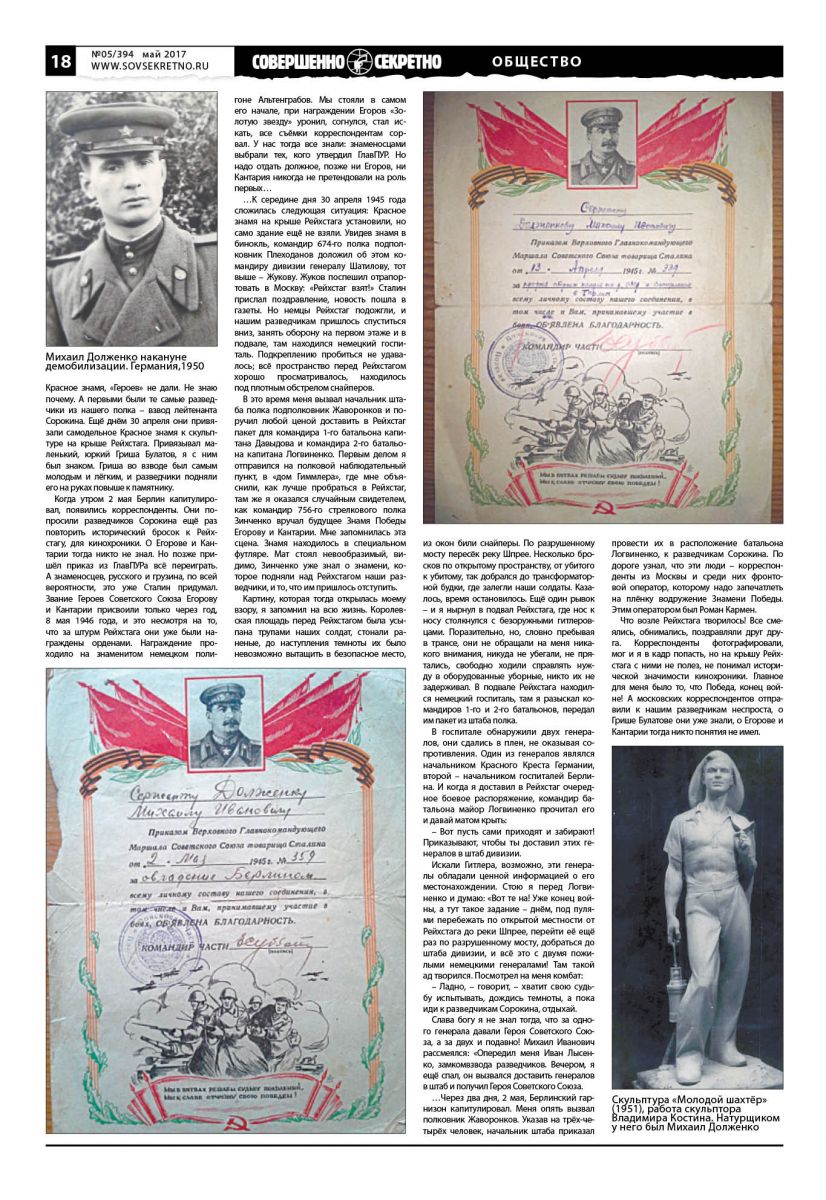 …A со Знаменем Победы целая канитель вышла. Много обиженных осталось. Тем, кто первым ворвался в Рейхстаг и водрузил Красное знамя, «Героев» не дали. Не знаю почему. А первыми были те самые разведчики из нашего полка – взвод лейтенанта Сорокина. Eщё днём 30 апреля они привязали самодельное Красное знамя к скульптуре на крыше Рейхстага. Привязывал маленький, юркий Гриша Булатов, я с ним был знаком. Гриша во взводе был самым молодым и лёгким, и pазведчики подняли eго на руках повыше к памятнику.