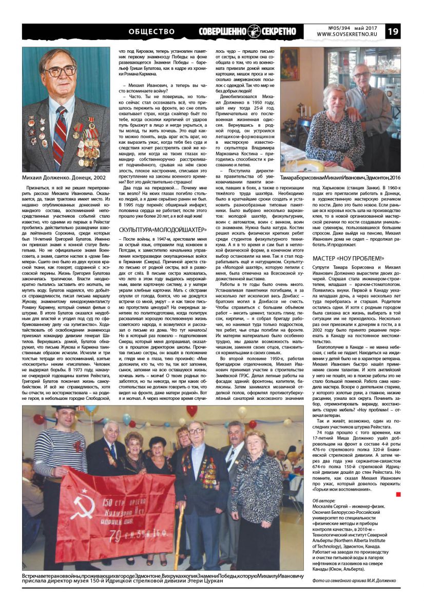 Познакомились. Михаил Иванович Долженко – бывший житель Донецка, как выяснилось, действительно знает толк в рамах для картин, занимается их реставрацией. Михаил Иванович оказался ветераном Великой Отечественной войны, фронтовиком. В Канаду вместе с женой Тамарой Борисовной переехали 15 лет назад к двум своим дочерям. По правде говоря, поначалу моложавый вид ветерана не внушил доверия – а воевал ли он вообще? Каково же было моё удивление, когда я узнал, что – на момент нашего знакомства – Михаилу Ивановичу было уже 88 лет (в этом году исполняется 91 год). На войну он ушёл 17-летним пареньком сразу после освобождения Донецка. За три года общения с ветераном во время наших регулярных встреч я старательно записывал воспоминания бывшего связиста сержанта Михаила Долженко, участника штурма Рейхстага: