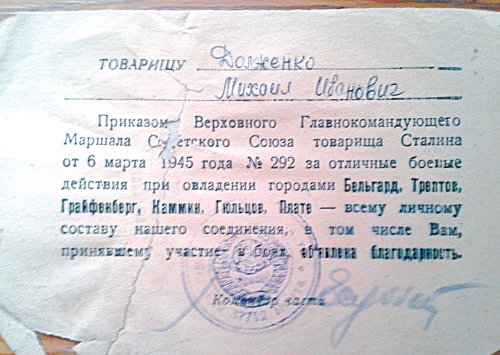 Слава богу я не знал тогда, что за одного генерала давали Героя Советского Союза, а за двух и подавно! Михаил Иванович рассмеялся: «Опередил меня Иван Лысенко, замкомвзвода разведчиков. Вечером, я ещё спал, oн вызвался доставить генералов в штаб и получил Героя Советского Союза.