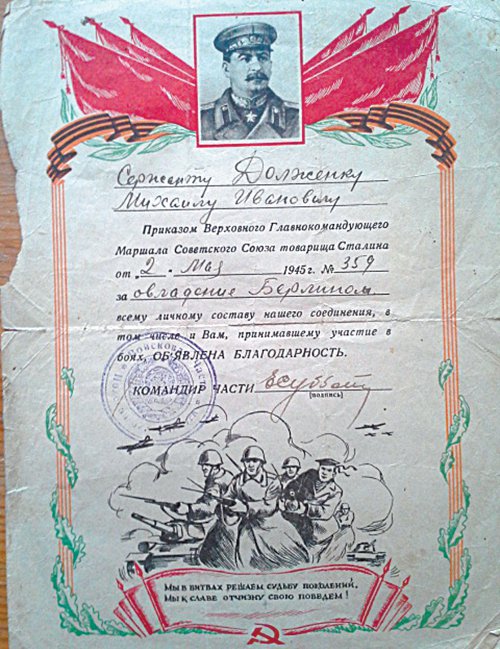 – Войну я закончил 2 мая в Берлине, так что Победу отпраздновал в самом логове, – Михаил Иванович открыл несколько книг, все о войне, с дарственными надписями авторов. Я взял одну из книг и прочёл: «Михаилу Ивановичу Долженко на добрую память от автора.