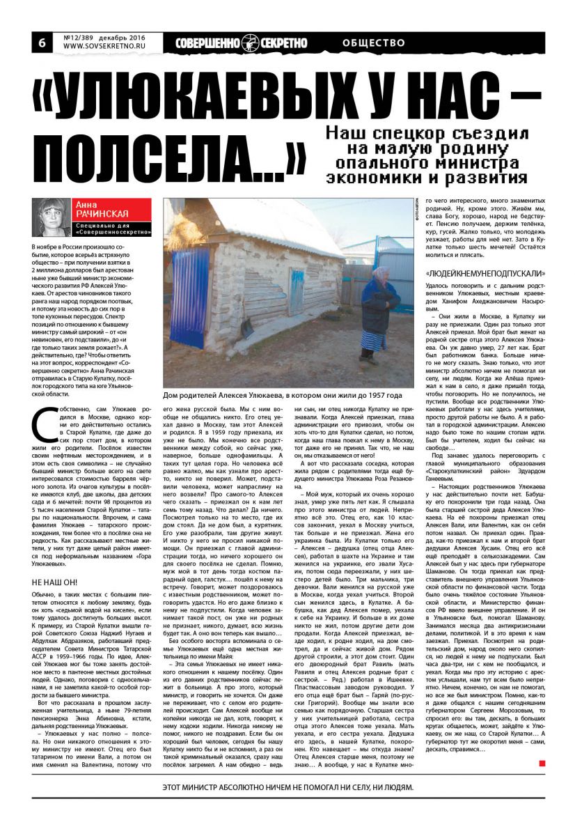 В ноябре в России произошло событие, которое всерьёз встряхнуло общество – при получении взятки в 2 миллиона долларов был арестован ныне уже бывший министр экономического развития РФ Алексей Улюкаев. От арестов чиновников такого ранга наш народ порядком поотвык, и потому эта новость до сих пор в топе кухонных пересудов. Спектр позиций по отношению к бывшему министру самый широкий – от «он невиновен, его подставили», до «и где только таких земля рожает?». А действительно, где? Чтобы ответить на этот вопрос, корреспондент «Совершенно секретно» Анна Рачинская отправилась в Старую Кулатку, посёлок городского типа на юге Ульяновской области.