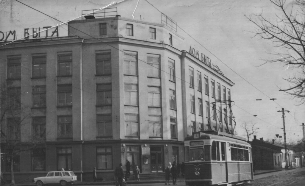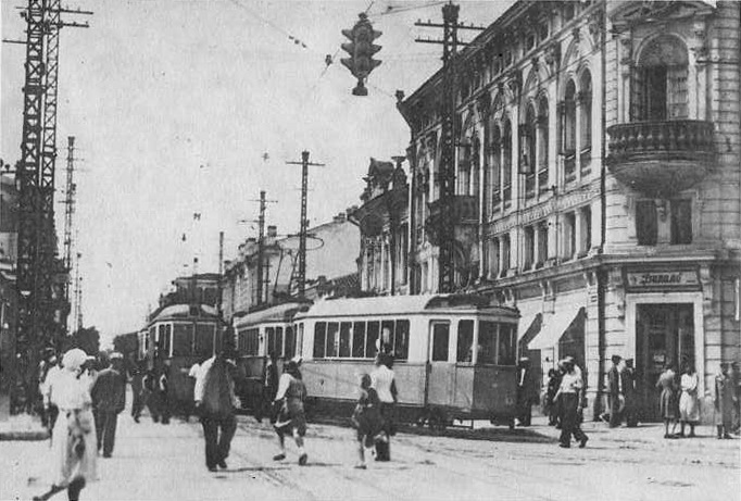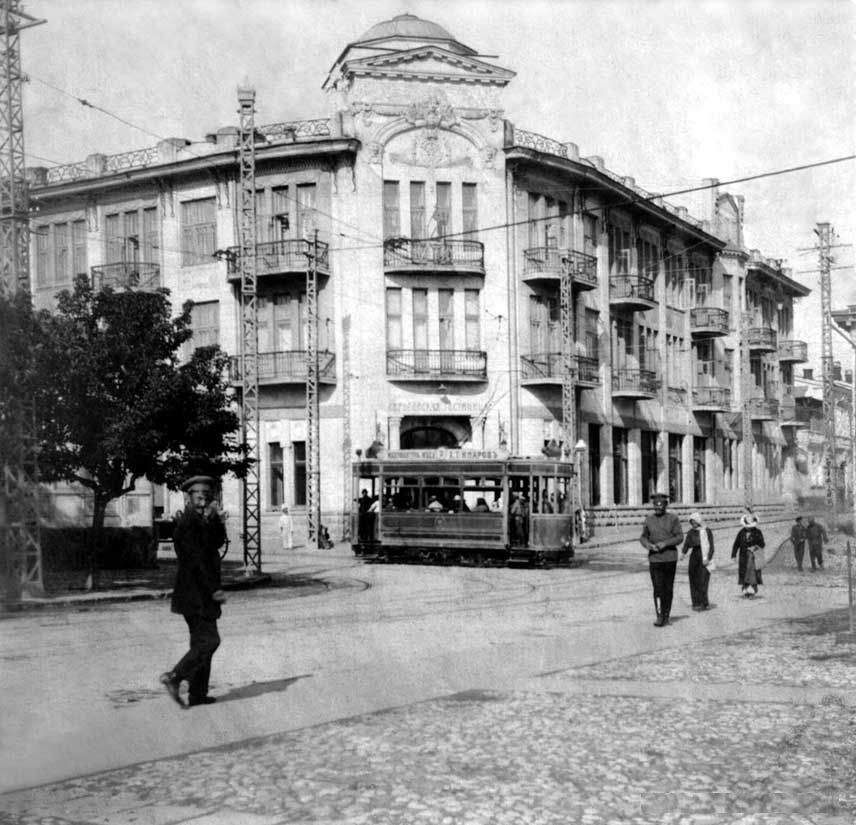Трамвай на улице Пушкина (справа — «дом Семирджиева» с магазином «Динамо»).