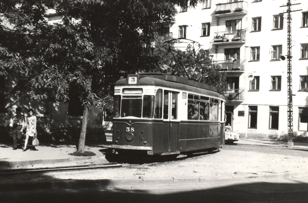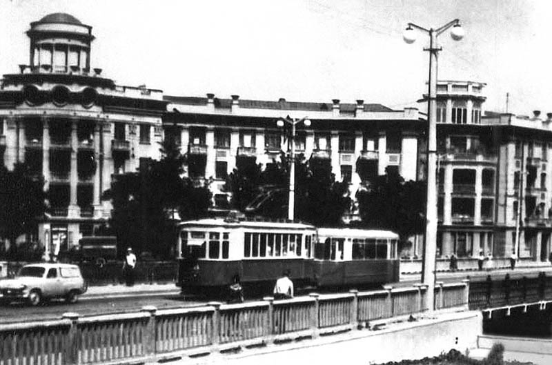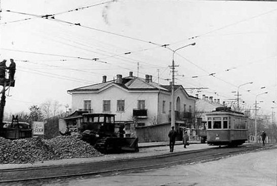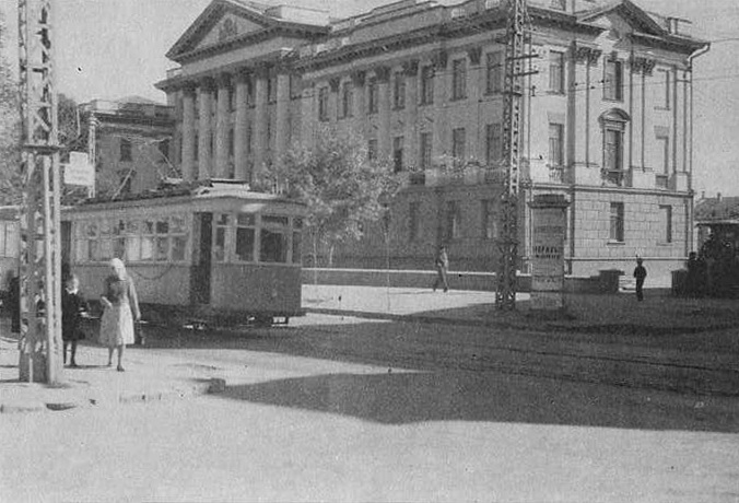 Трамвай едет по проспекту Кирова (место, где снимал автор — ныне площадь Ленина, а в то время — площадь Фонтанная). До середины 1950-х годов
