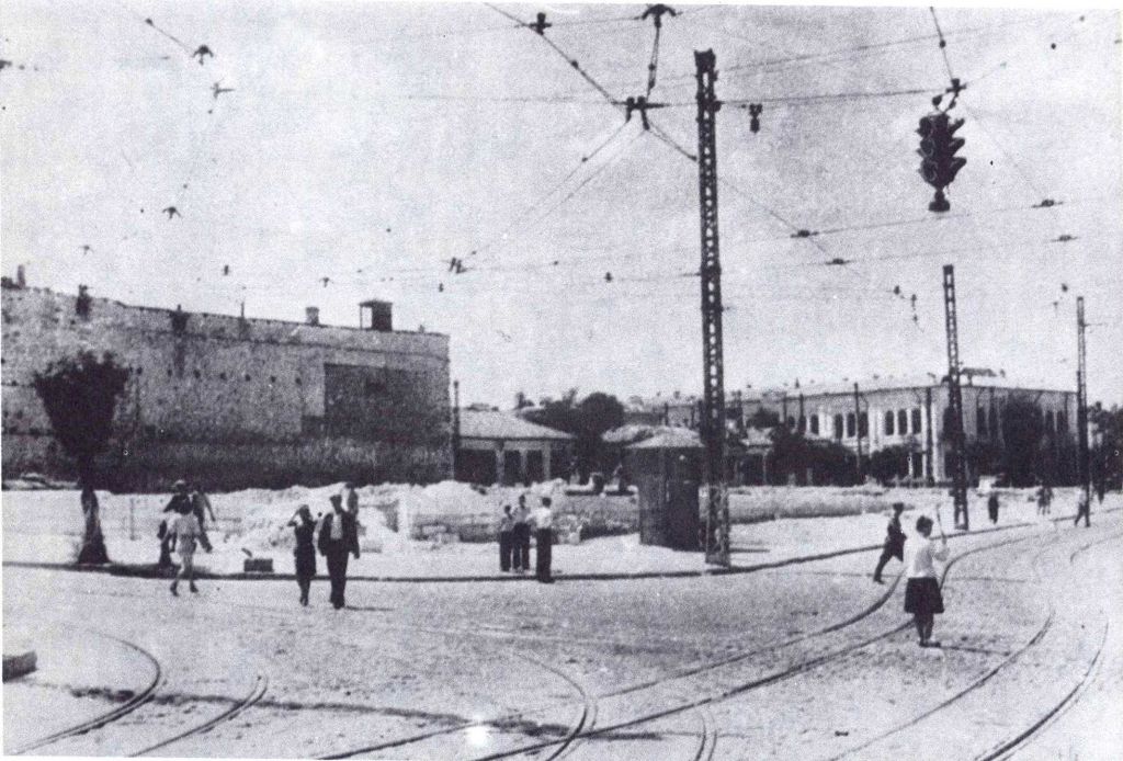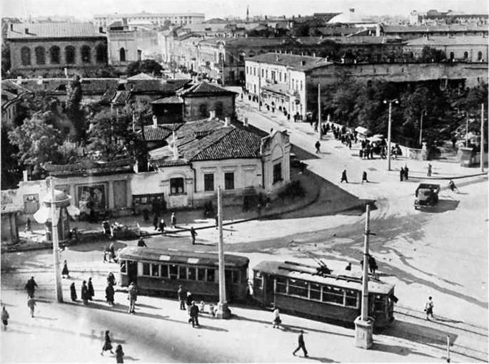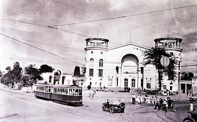 Трамвайные пути возле довоенного железнодорожного вокзала Симферополя (разрушенного во время войны)