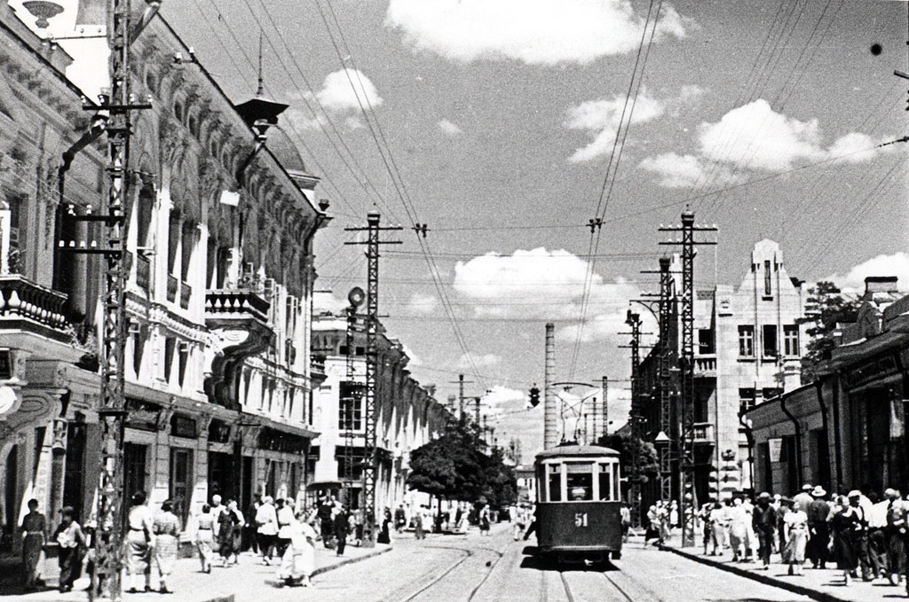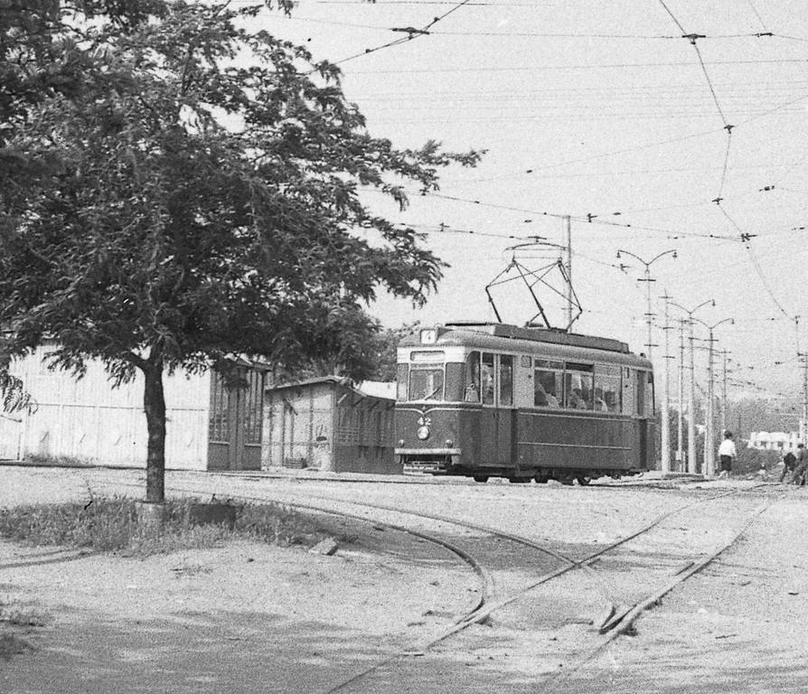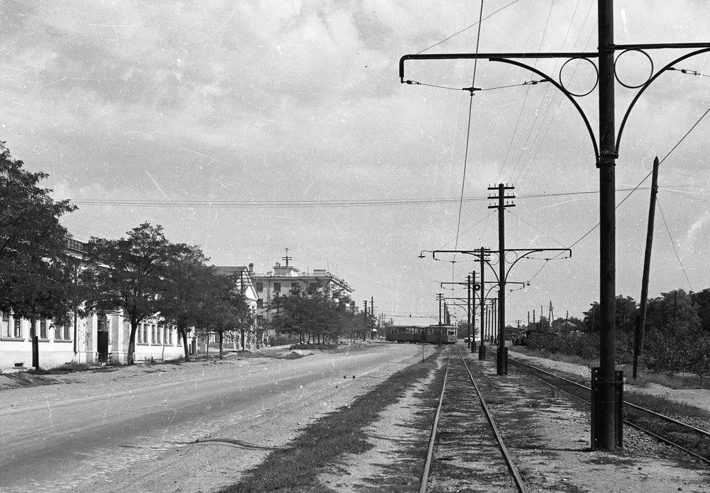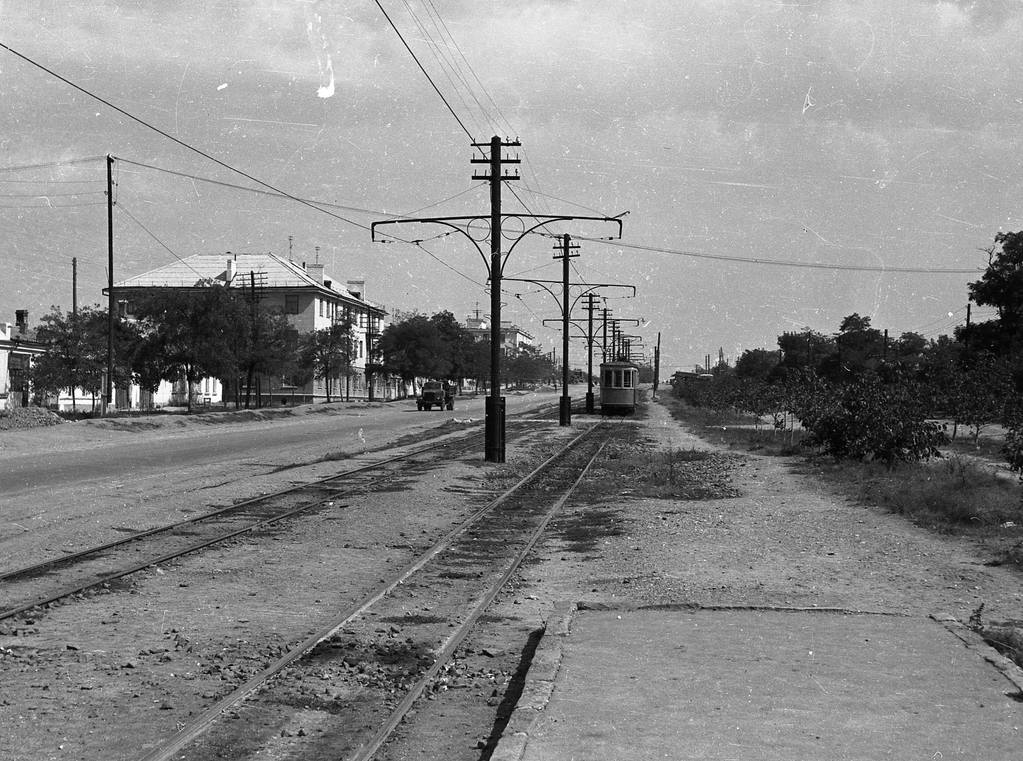 Трамвай № 42 4-го маршрута поворачивает с Феодоссийского шоссе (ныне проспект Победы) на улицу Оборонную (ныне улица 51-й армии)