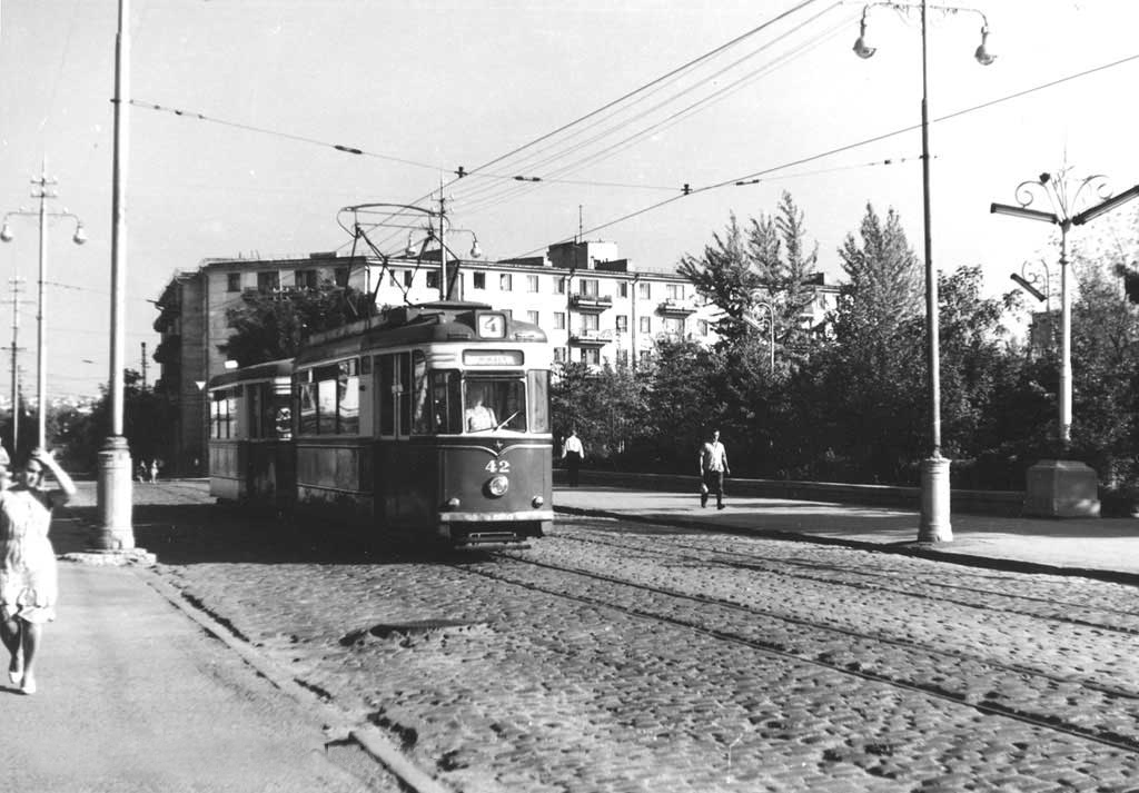Трамвайная сцепка на трамвайном мосту и автобус ЗИС-155 на автомобильном