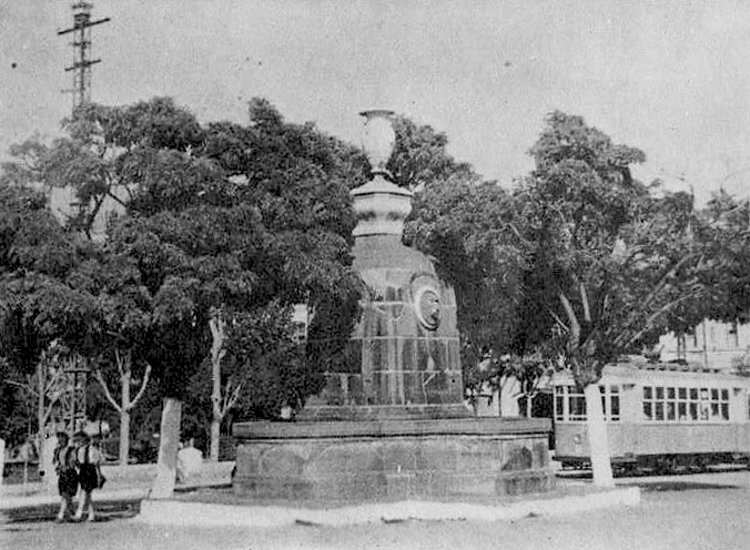 За трамваем, в центре привокзальной площади, памятник Сталину