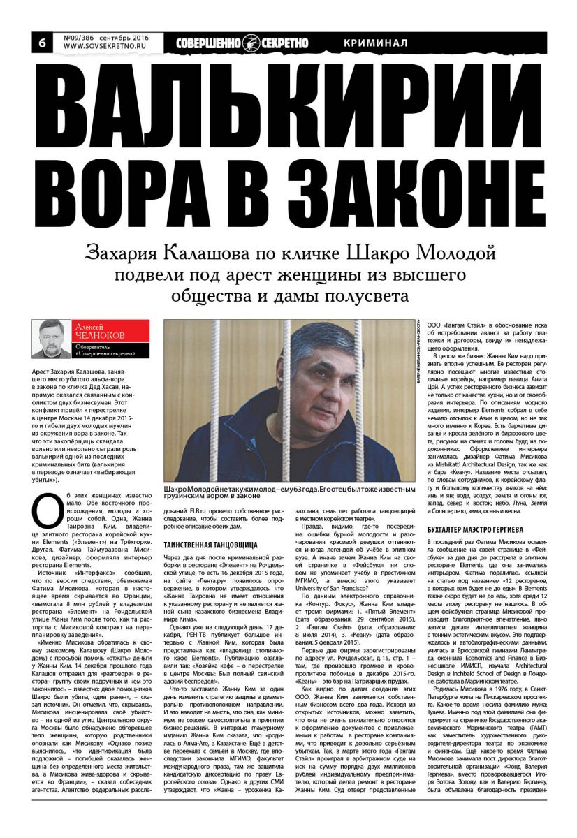«Именно Мисикова обратилась к своему знакомому Калашову (Шакро Молодому) с просьбой помочь «отжать» деньги у Жанны Ким. 14 декабря прошлого года Калашов отправил для «разговора» в ресторан группу своих подручных и чем это закончилось – известно: двое помощников Шакро были убиты, один ранен», – сказал источник. Он отметил, что, скрываясь, Мисикова инсценировала своё убийство – на одной из улиц Центрального округа Москвы было обнаружено обгоревшее тело женщины, которую родственники опознали как Мисикову. «Однако позже выяснилось, что идентификация была подложной – погибшей оказалась женщина без определённого места жительства, а Мисикова жива-здорова и скрывается во Франции», – сказал собеседник агентства. Агентство федеральных расследований FLB.ru провело собственное расследование, чтобы составить более подробное описание обеих дам.