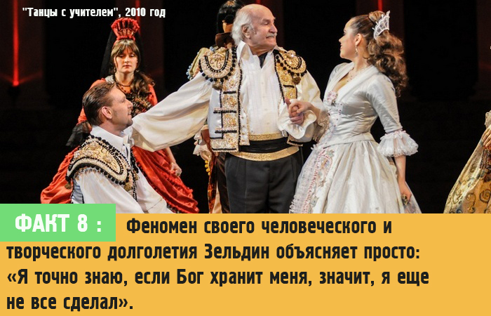 10 февраля 2016 года Владимиру Михайловичу Зельдину исполнился 101 год. И свой день рождения он по традиции отметил на сцене Центрального академического театра Российской армии в очередном показе постановки Учитель танцев.