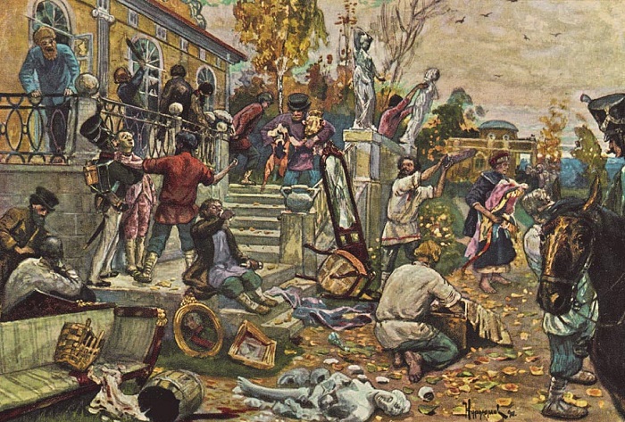 Вскоре после начала нашествия отмечались случаи, когда крепостные отказывались выполнять привычные обязанности и даже устраивали небольшие бунты. Бывало, что они грабили усадьбы, оставленные бежавшими дворянами. В письме к другу один помещик описывал, как после прихода французских фуражиров, которые взяли себе всё им потребное в его имении, крепостные набросились на барское добро и растащили остальное. Когда местные власти испарялись, крестьяне начинали вести себя как «разбойники», нападали даже на священников и пытали их, стараясь выведать, где запрятаны существовавшие или мнимые церковные сокровища.