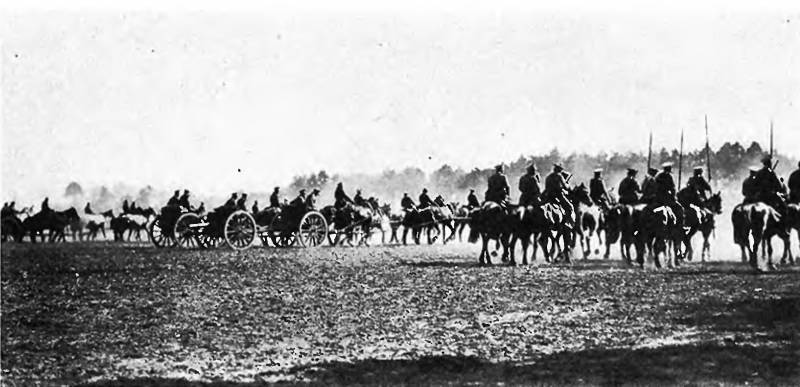 Ил. 1. У дер. Волчецк. Русские кавалеристы увозят часть своих артиллерийских трофеев – 6-орудийную крупповскую батарею.