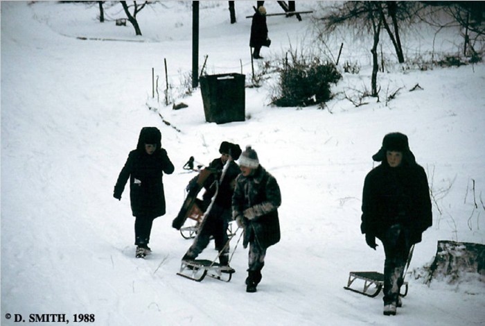 Дети, катающиеся на санках. СССР, Пятигорск, 1988 год.