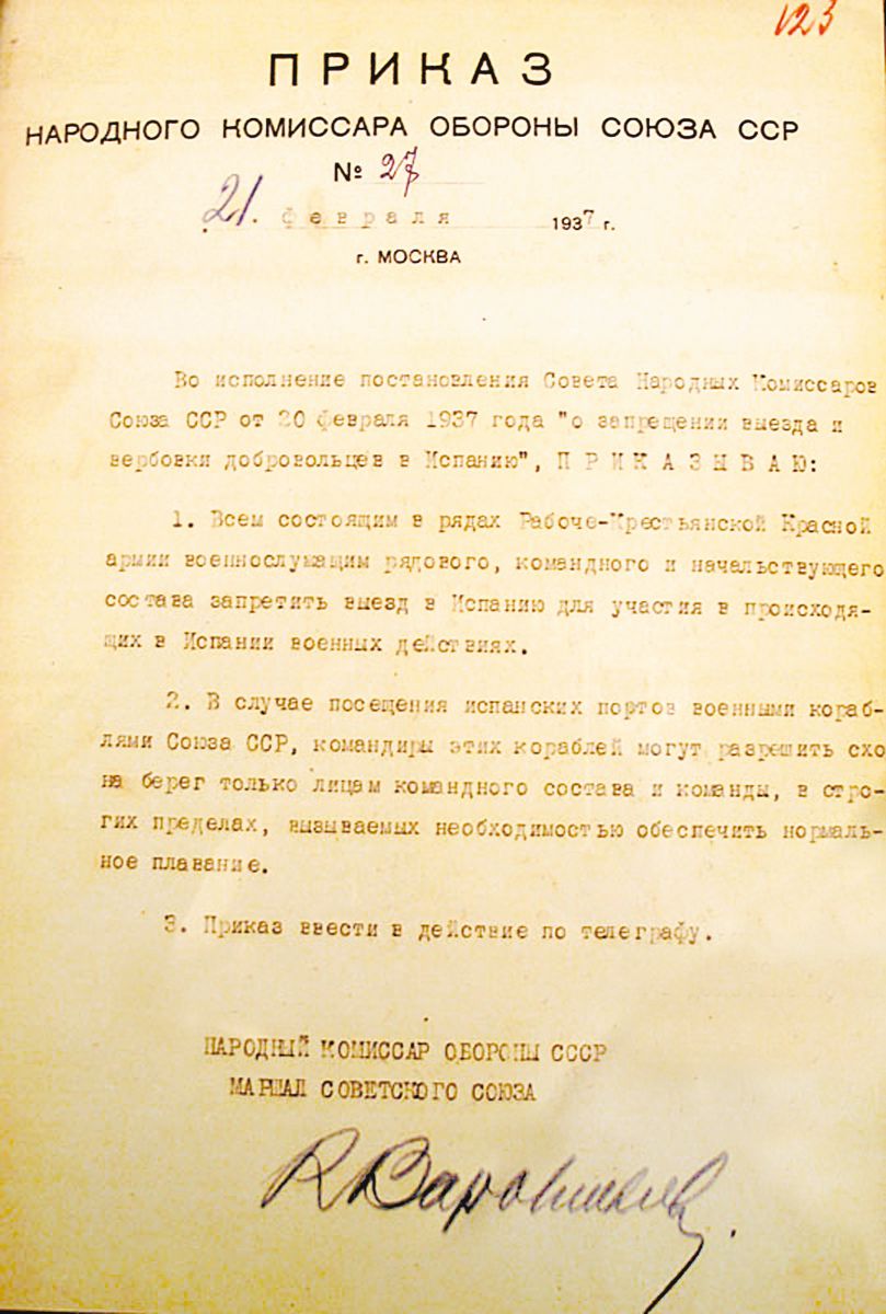 1. Всем состоящим в рядах Рабоче-Крестьянской Красной армии военнослужащим рядового, командного и начальствующего состава запретить выезд в Испанию для участия в происходящих в Испании военных действиях.