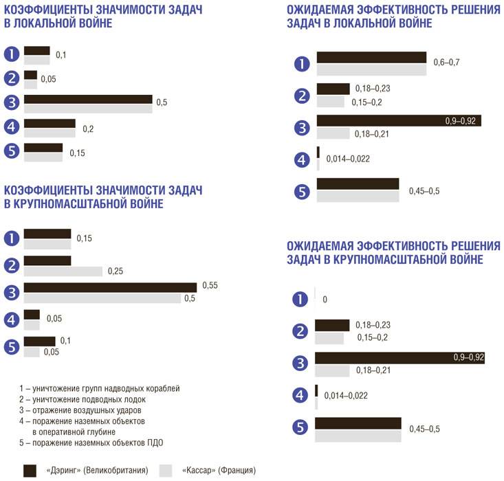 В крупномасштабной войне весовые значения задач «Дэринга» и «Кассара» различаются. Для первого их можно оценить следующим образом: уничтожение групп надводных кораблей – 0,15, подводных лодок – 0,15, отражение средств воздушного нападения – 0,55, нанесение ударов по наземным целям в оперативной глубине – 0,05, по объектам противодесантной обороны – 0,1. Для «Кассара»: уничтожение групп надводных кораблей – 0,15, подводных лодок – 0,25, отражение средств воздушного нападения – 0,5, нанесение ударов по наземным целям в оперативной глубине – 0,05, по объектам ПДО – 0,05.