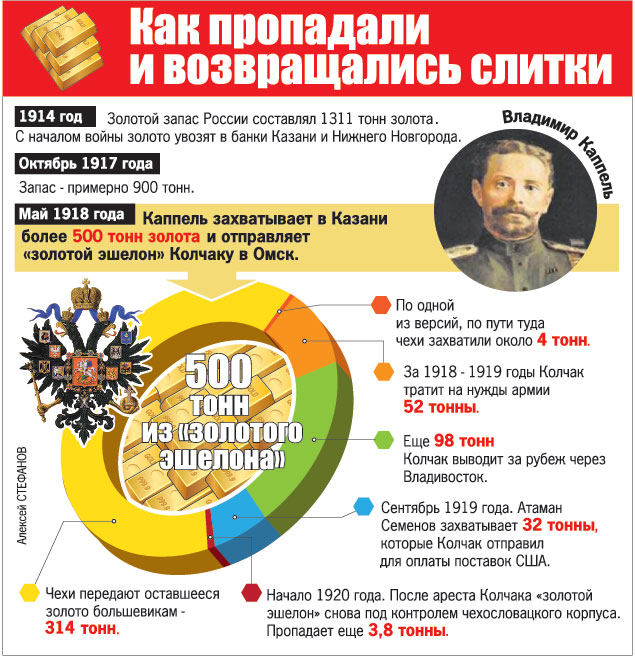 – Захваченное в Казани золото сначала частично переводили на счета колчаковского правительства в западных банках, а потом постепенно снимали, – продолжает Владимир Карелин. – Часть средств была в золотых царских империалах или слитках с клеймом русского Госбанка. Оно вывозилось через Владивосток за рубеж, в том числе в Швецию и Норвегию. После разгрома Белого движения официальной возможности распоряжаться этими средствами уже не было. Поэтому золото переплавлялось и с перебитыми клеймами утекало в Америку. Последние годы многие лидеры Белого движения провели в неплохих условиях на юге Франции. Кроме того, часть денег предназначалась для продолжения борьбы с красными.