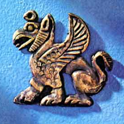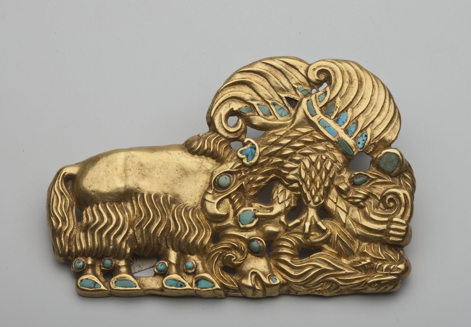 На фото: ПРЯЖКА – ПЛАСТИНА ПОЯСНАЯ – СХВАТКА ГРИФОНА С ЯКОМ. IV-III ВВ. ДО Н.Э. ЗОЛОТО, БИРЮЗА. ПЛАСТИНА ПРОИСХОДИТ ИЗ СИБИРСКОЙ КОЛЛЕКЦИИ ПЕТРА